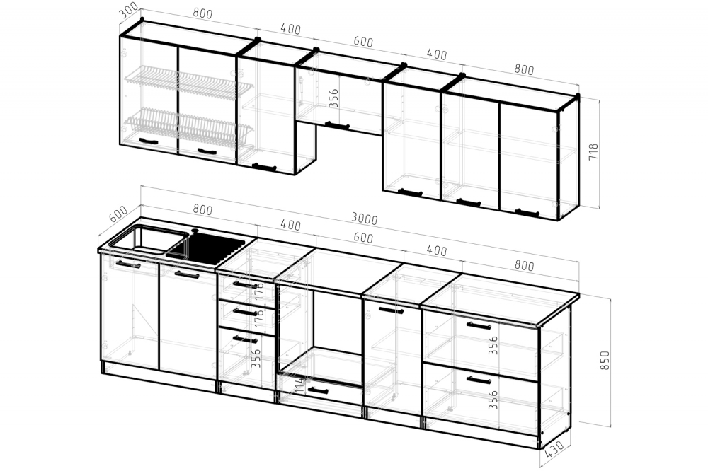 Ширина: 3000 мм; Глубина: 600 мм (со столешницей)